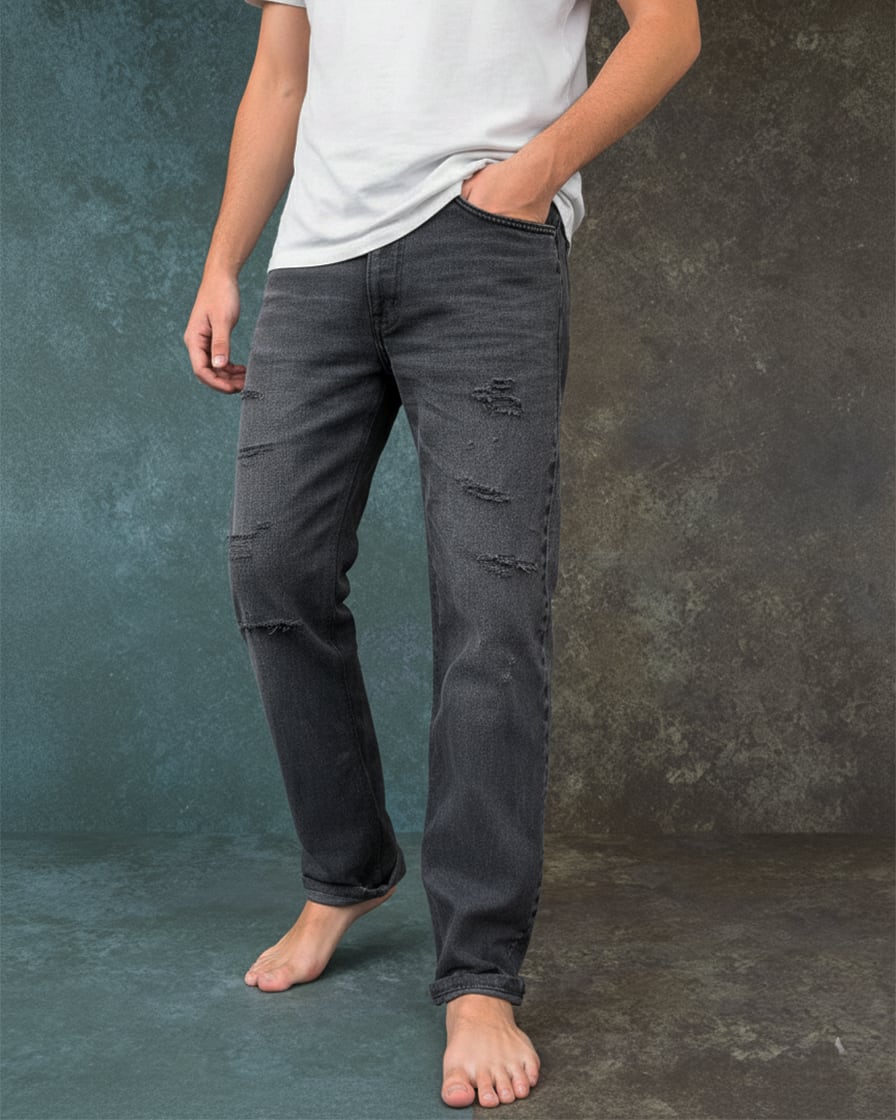 ブラックデニム特有の深みあるトーンに、自然なフェード感とダメージをバランス良く配置。