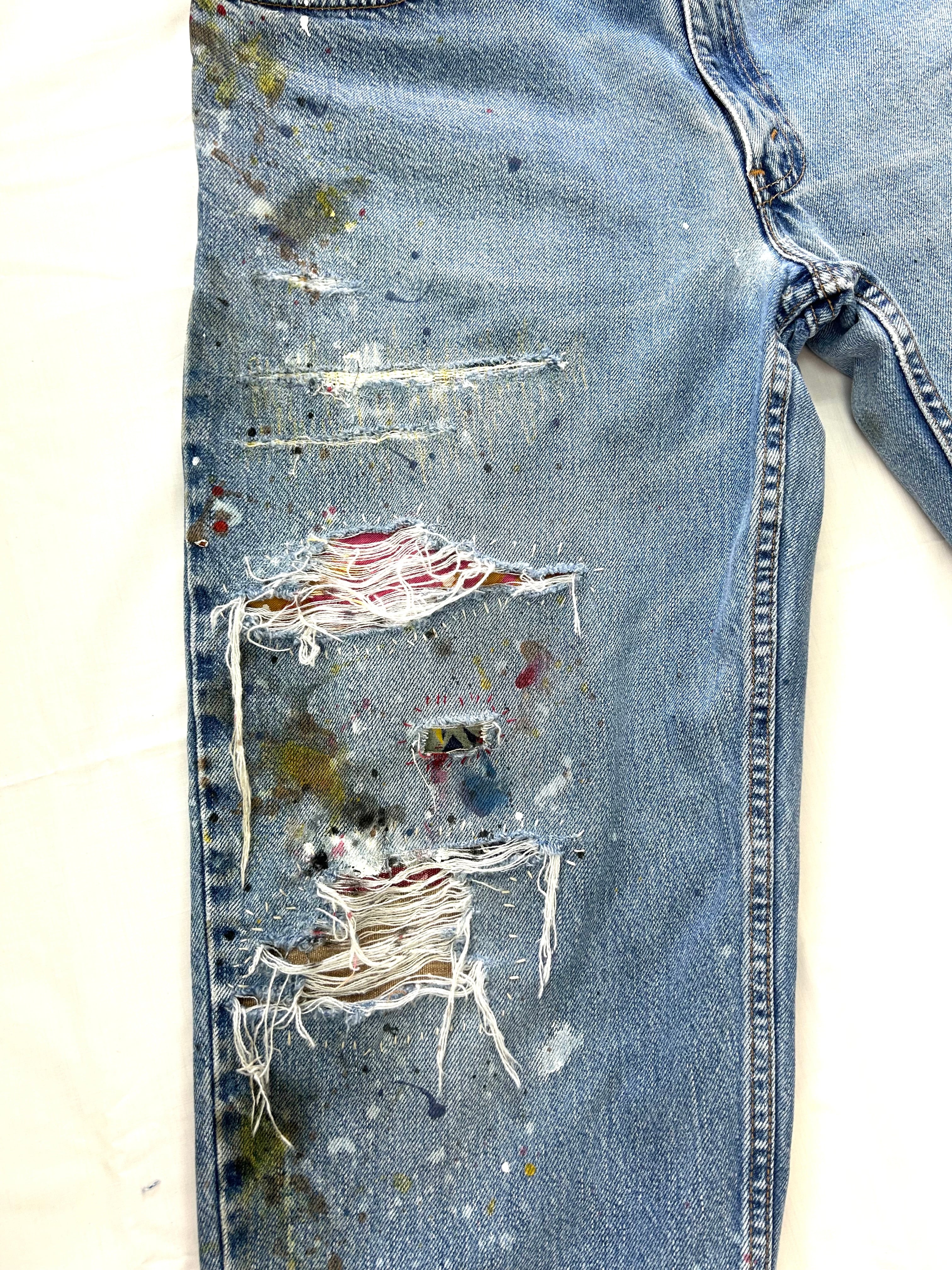 カジュアルスタイルにもアートピースとしても成立する、まさに一点物のリメイクデニムです。