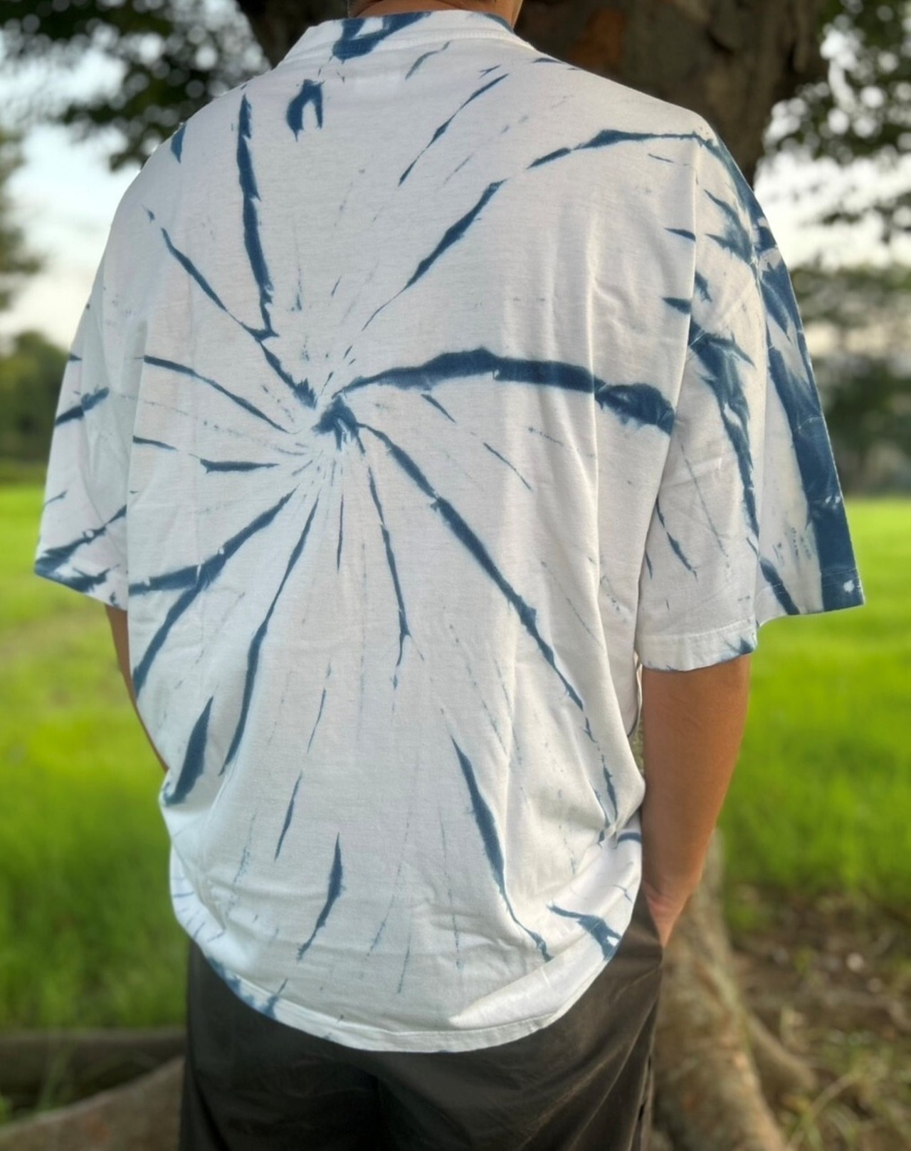 そんな独創的なプリントに藍で絞り染めを施し、デザインを邪魔しないよう細い線で染めました。