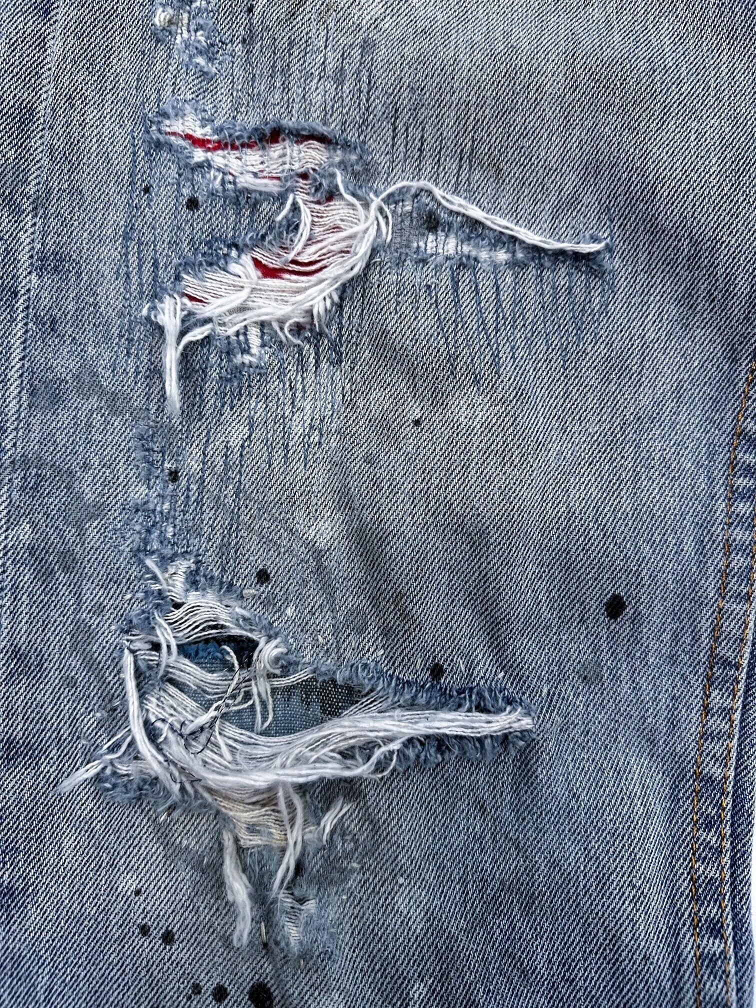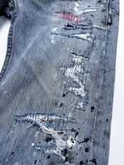 色落ち加工、ダメージ、ハンドステッチ、ミシン、ペンキ、汚し――
