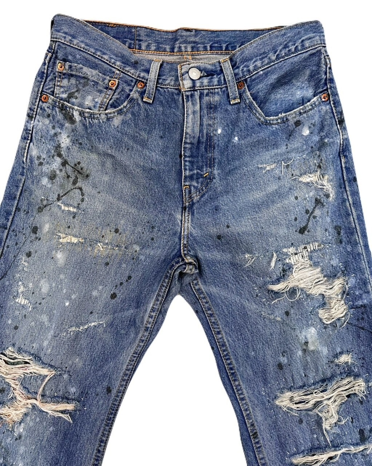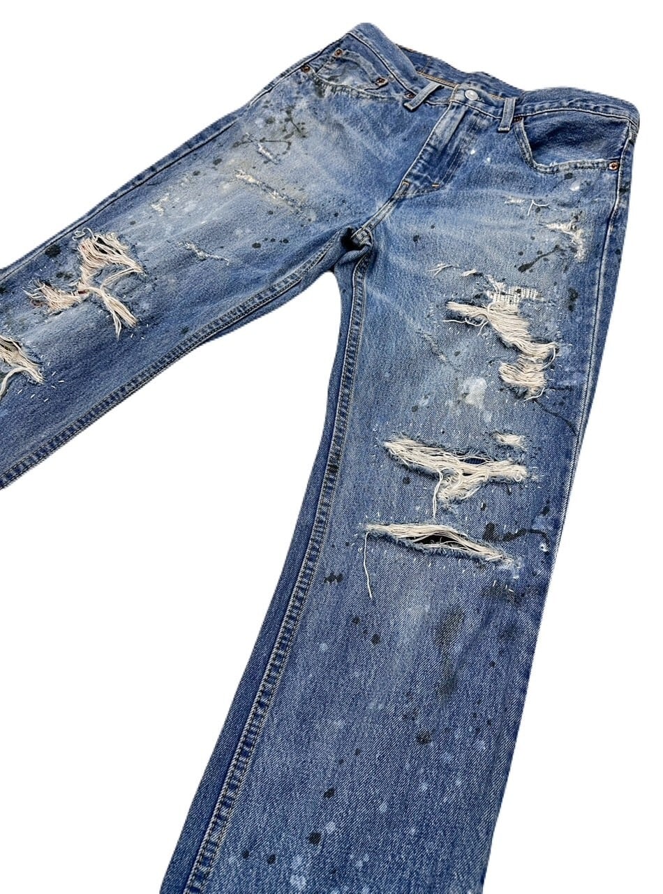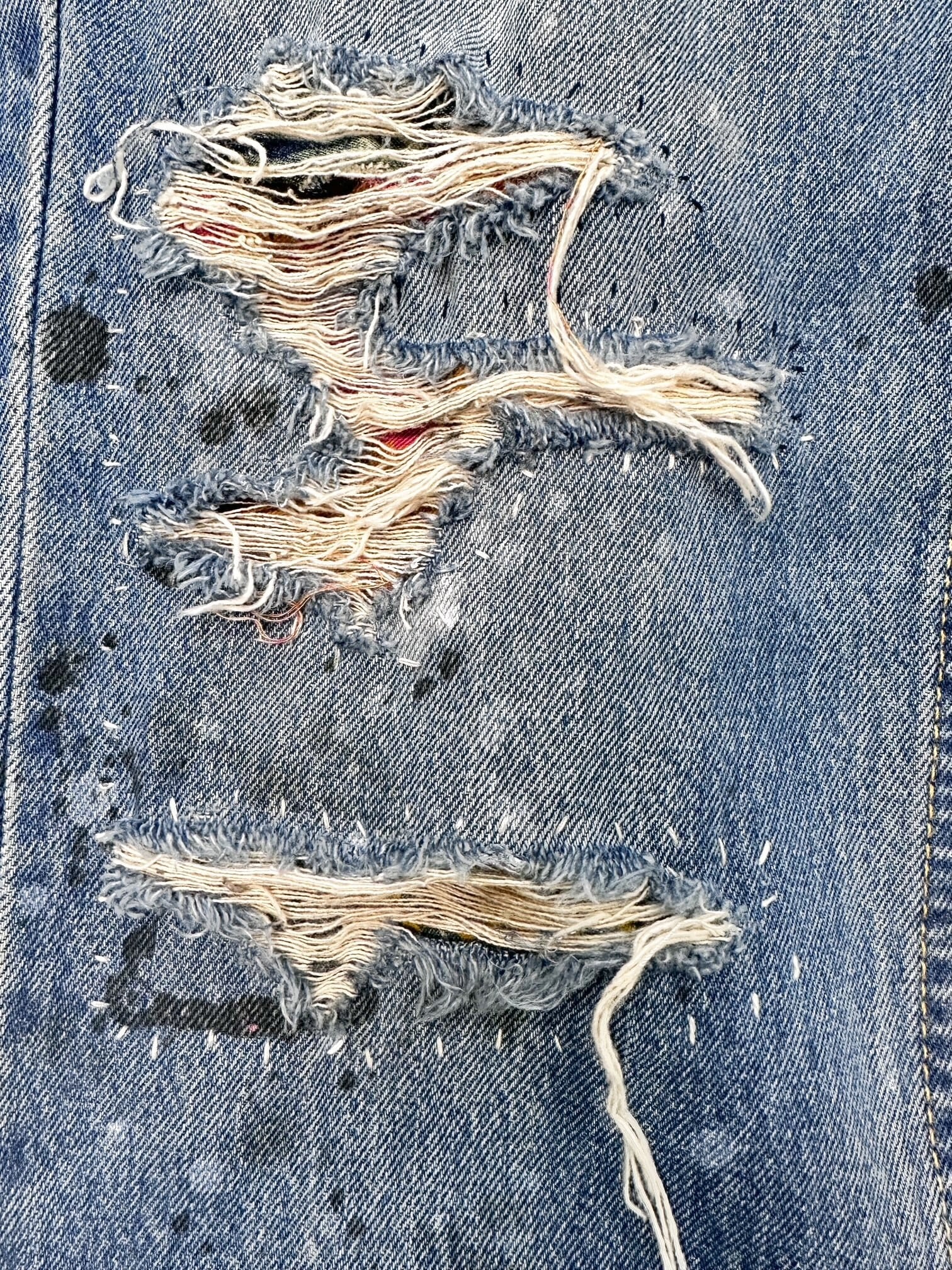 色落ち加工、ダメージ、ハンドステッチ、ミシン、ペンキ、汚し――