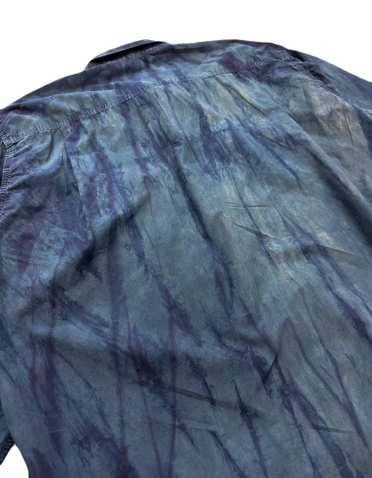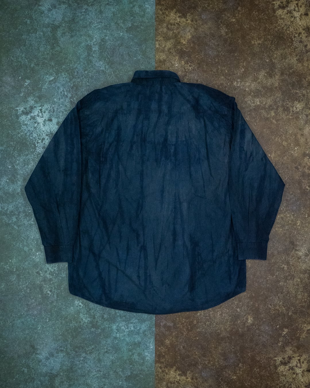 高密度のパリッとした生地が染料を弾くことで生まれた不均一さは、奥行き感を与え唯一無二の一着に仕上がりました。